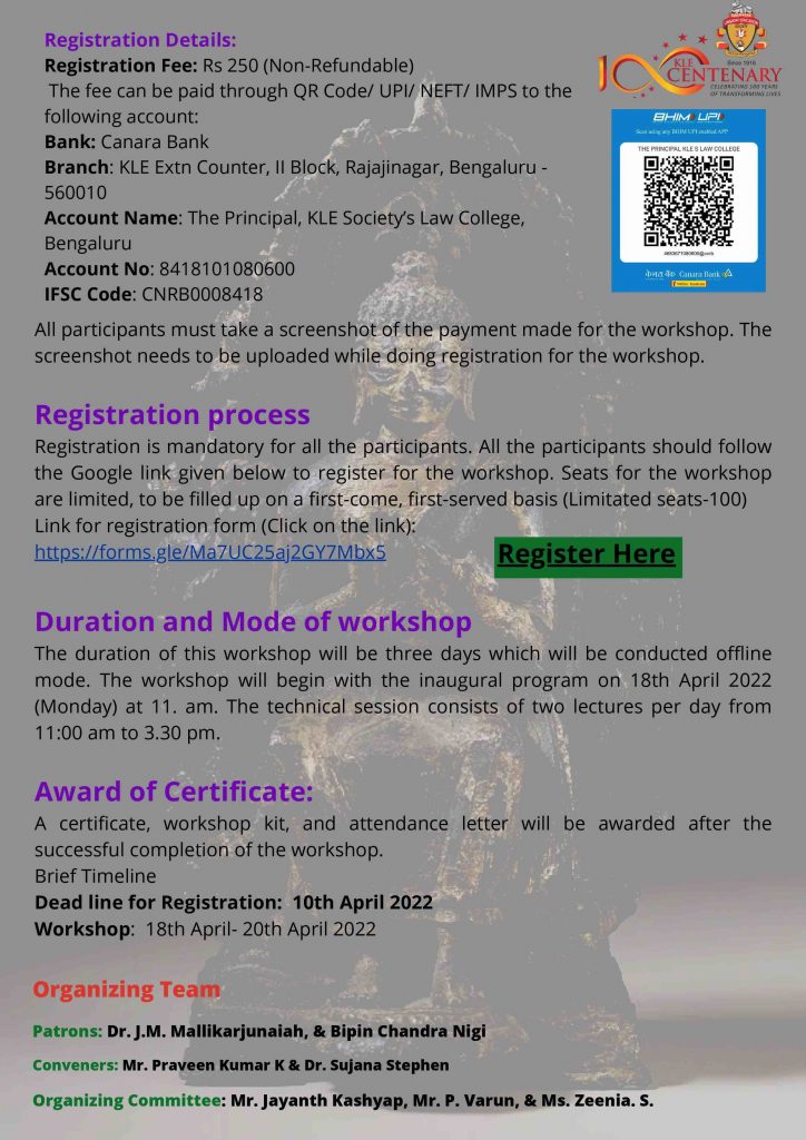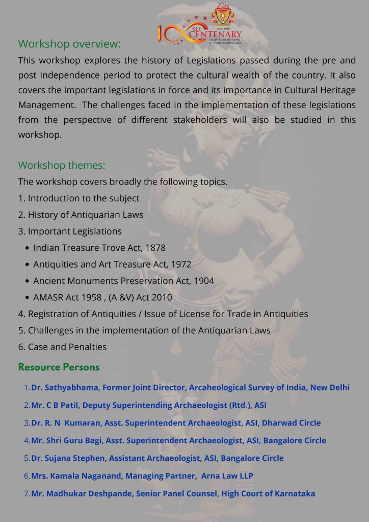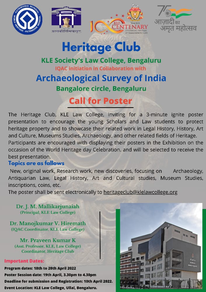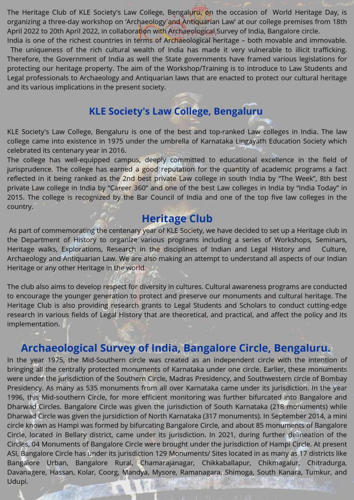 KLE Society’s Law College’s Heritage Club & IQAC in collaboration with Archaeological Survey of India, Bangalore Circle, Bengaluru is coming up with with the above said workshop. Be part of this mega event to be held during 18th – 20th April 2022.
