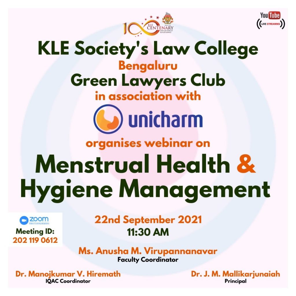 KLE Society’s Law College, Bangalore Green Lawyer Club in Association With the Unicharm organises a webinar on “Menstrual Health and Hygiene Management” on 22-09-2021 at 11:30 AM.